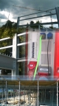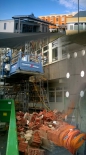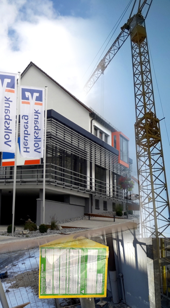 Umbau und Erweiterung Volksbank Heuberg, Meßstetten. Besondere Herausforderung: Baustelle an Durchgangsstraße und bei laufendem Bankbetrieb. Anpassung Gerüst an Bauzustände (Gerüstumbau, Arbeits- und Standsicherheit), Montage von Fertigteilen, Krankbetrieb, Umbauarbeiten (Bauzustände, Abbruch, Installationen), Entsorgung von Altmaterialien.