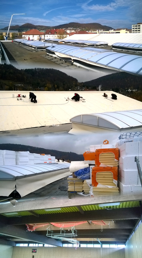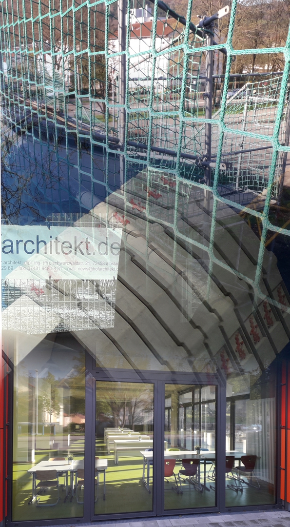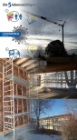 Neubau Mensa Sprachheilschule, Balingen. Besondere Herausforderung: Baustelle in Schulhof- und Zugangsbereich von Grundschule, Sprachheilschule und Turnhalle. Umbau und Anbindung an bestehende Versorgungsleitungen. Arbeiten mit Betonfertigteilen. Sicherung der Arbeiten an Dach und Fassade gegen Absturz. Arbeiten auf Leitern, fahrbaren Gerüsten und Hubarbeitsbühnen. Anpassung Außenanlagen bei laufendem Schulbetrieb.