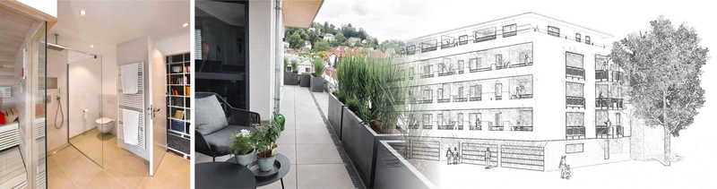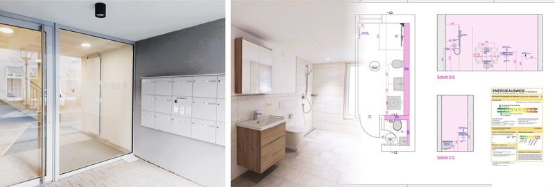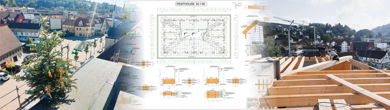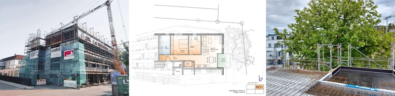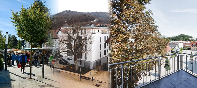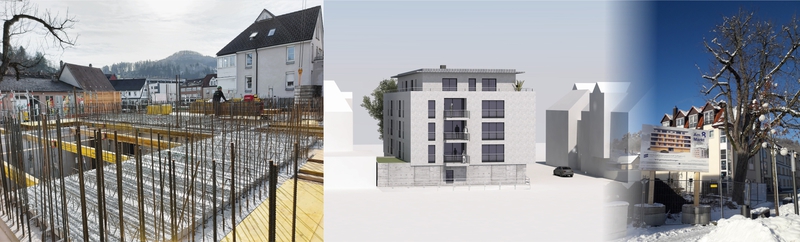 Wohnen im Zentrum anstatt an den Hängen oder auf den Hügeln. Diesem Trend folgte die Wohnungsbaugenossenschaft Tailfingen eG bereits mit ihrem Neubau "Am Markt 7". Die dort realisierten 18 Wohnungen waren sofort verkauft, und so dachten Vorstandschaft und Aufsichtsrat schnell über einen weiteren Neubau in der "Neuen Mitte" Tailfingens nach. 2019 konnte dann das Gebäude "Am Markt 8" erworben werden, samt benachbartem Grundstück. Aufgrund unserer bisherigen Sanierungstätigkeit für die WBG Tailfingen bekamen wir die Chance, uns Gedanken für einen Neubau zu machen, an dieser prominenten Stelle im Herzen Tailfingens. Es folgte eine ausführliche Planungsphase unter Berücksichtigung des Städtebaus und einer möglichst hohen Grundsücksausnutzung und damit Wirtschaftlichkeit. Dem Anspruch an ein hochwertiges, architektonisch ansprechendes Gebäude wollten wir ebenfalls gerecht werden.