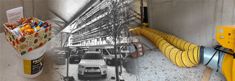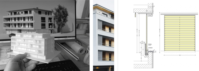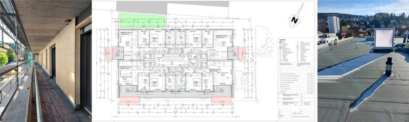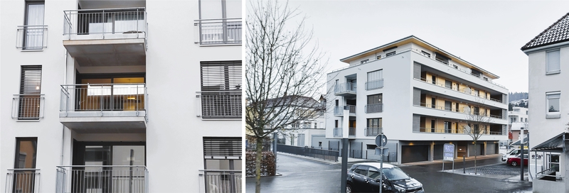 Ein intensiver Austauch zwischen der erfahrenen Bauherrschaft und dem Architekten führte zu dem nun realisierten, fünfgeschossigen Flachdachgebäude mit 14 Wohnungen. Alle Wohnungen sind stufenlos und altersgerecht nuzbar und besitzen je einen eigenen Freibereich. Im Erdgeschoss befinden sich Technik- und Nebenräume sowie acht Garagen- und zwei Stellplätze iim Freien. Mit Ausnahme des Penthouses, das in Holzbauweise errichtet wurde, handelt es sich um einen Massivbau. Mit seiner hervorragenden Gebäudehülle, Wärmepumpentechnik und wohnungszentralen Zu- und Abluftanlagen mit Wärmerückgewinnung ist das Haus auch in energetischer Hinsicht auf höchstem Niveau.