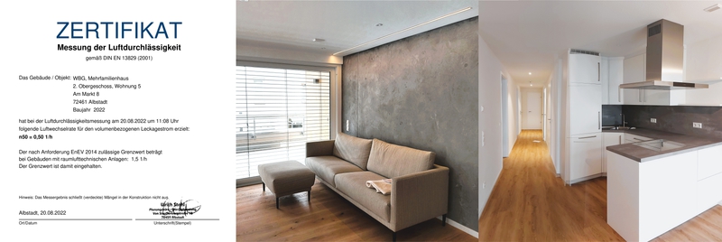 Der Erhalt der stadtbildprägenden Kastanie, die Farbgebung des Gebäudes mit Holzbekleidungen der Loggien, holzbekleideten Dachvorsprüngen und Holz-Schiebeläden vermitteln einen zurückhaltenden, wohnlichen Eindruck. Vom Bauantrag im Sommer 2020 über den Baubeginn im Dezember 2020 bis zur Fertigstellung im Sommer 2022 vergingen gerade mal 24 Monate, und das troz aller Schwierigkeiten durch die Coronapandemie, die auch der Kostenplanung nichts anhaben konnte: Die Kostenfeststellung lag unter unserer Berechnung.