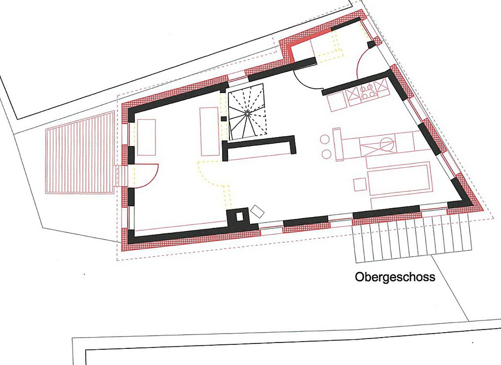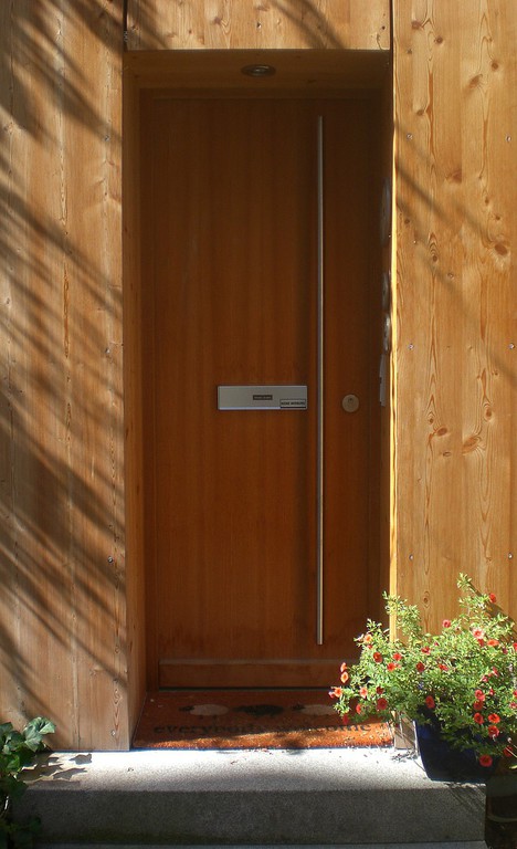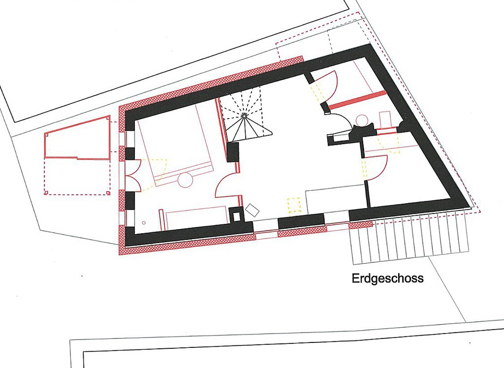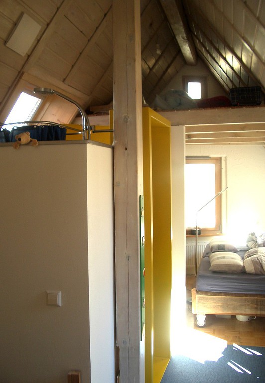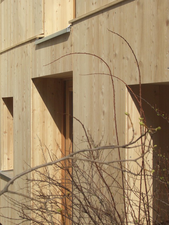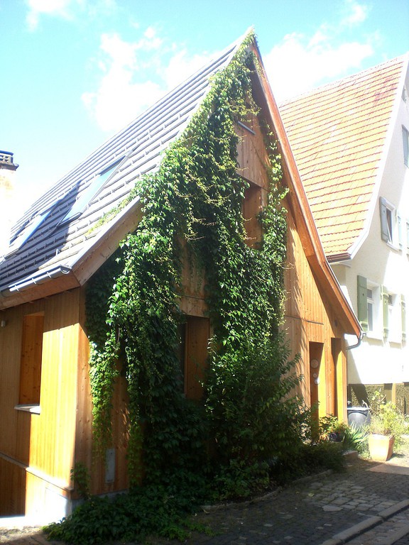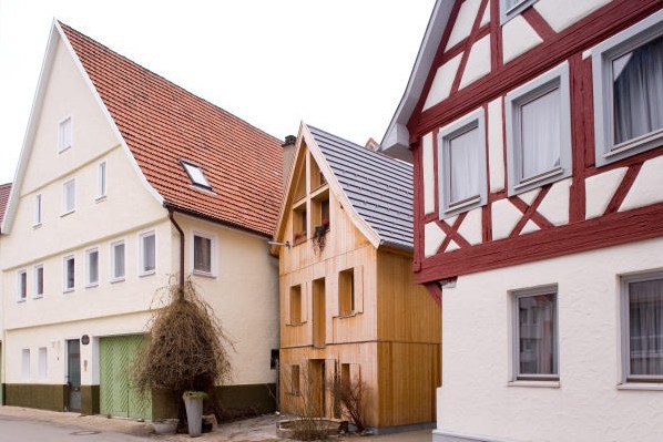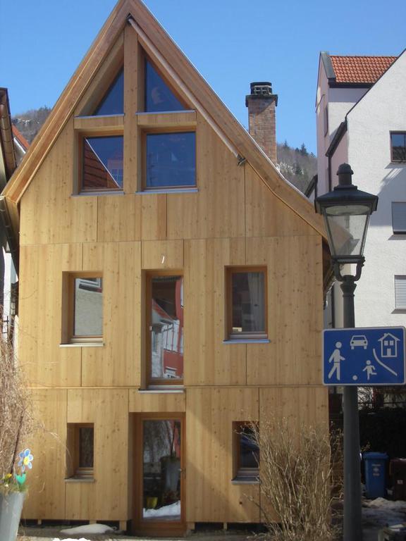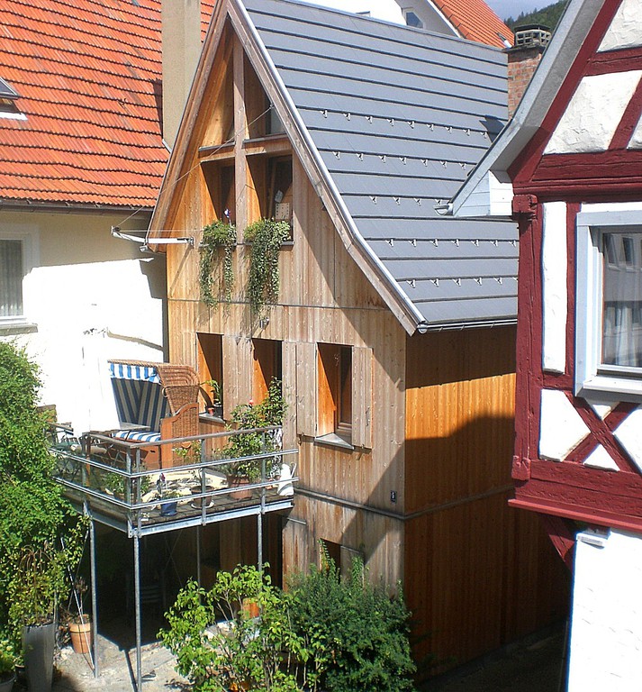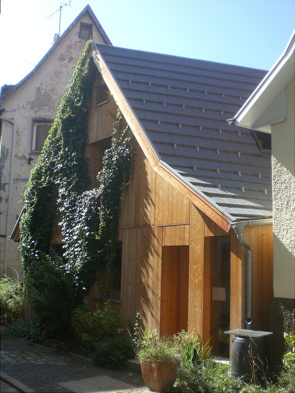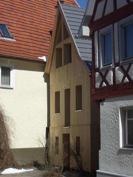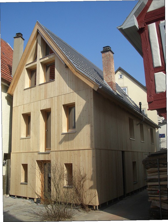Umbau und energetische Sanierung eines ehemaligen Gerberhauses in der Ebinger Altstadt. Wohn- und Nutzfläche ca. 110m², Gesamtbau- und Nebenkosten ca. 100.000 EUR. Entkernung und Neuorganisation der drei Geschosse für vier Personen: Im DG 2 Kinderzimmer mit Bad, im EG Küche-Essen-Wohnen mit Terrasse, im UG Schlafzimmer mit Dusche und Waschbecken, Arbeitsplatz, WC, Keller- und Technikraum. Komplett neue Installationen und größtenteils neue Oberflächen - im Wohngeschoss Eichendielen auf Fußbodenheizung. Neugestaltung der Fassaden mit Dreischichtplatten und Fenstern aus unbehandeltem Lärchenholz.