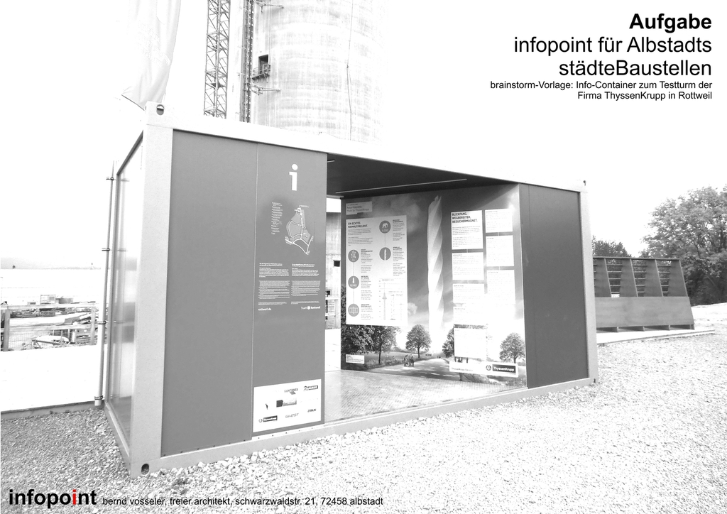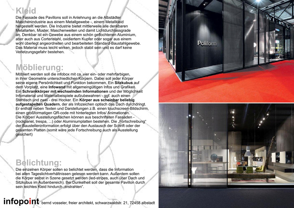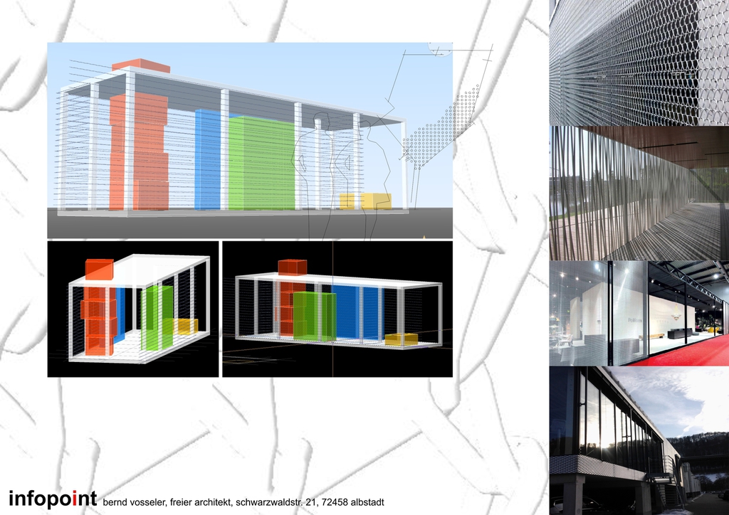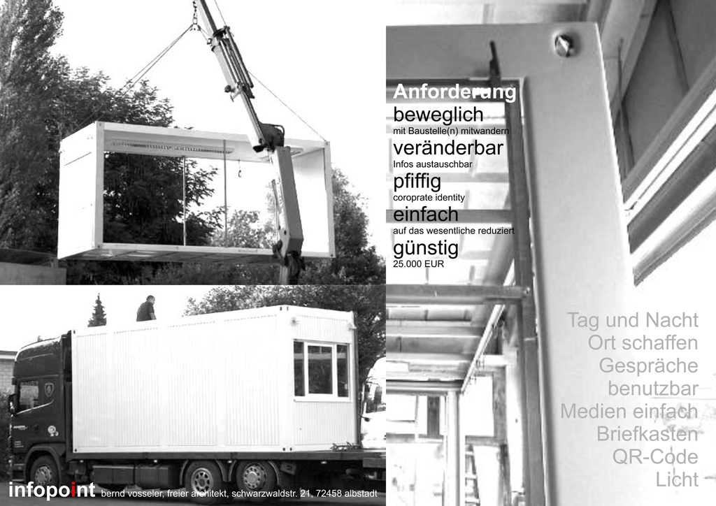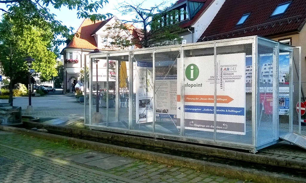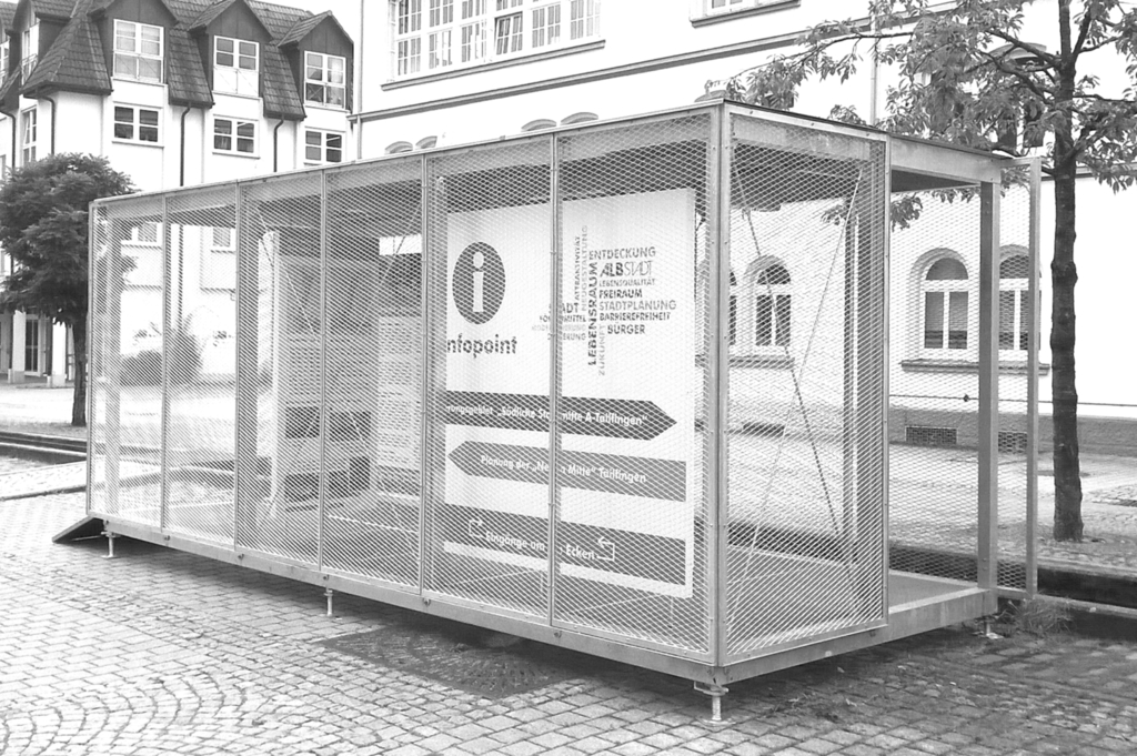"infopoint" für Albstadts städtebauliche Baustellen. Anforderung: transportierbar, Tag und Nacht begehbar, flexibel bestück- und erweiterbar, kostengünstig, corporate identity. Im Entwurfsprozess wurde untersucht, welche Arten von Info-Einrichtungen schon realisiert wurden. Die Möglichkeit, einen Standardcontainer umzubauen wurde zwei Entwürfen gegenüber gestellt. Die Entscheidung fiel auf eine einfache Stahlkonstruktion mit transluzentem, schützendem aber gleichzeitig "wunderfitzigem", identitätsstiftendem "Maschenkleid" und "Möblierung". Realisiert wurden zunächst nur vier Ausstellungstafeln, wobei die im Entwurf dargestellten interaktiven Elemente wie "Ausziehtafeln", "touchscreen" oder auch nur ein QR-code zur Weiterleitung auf eine aktuelle Info-Seite des Stadtplanungsamtes jederzeit nachrüstbar sind. Der infopoint wurde in der Werkstatt und auf dem Bauhof Tailfingen komplett hergestellt und fertig ausgestattet und war - dank Transport-Ösen und höhenverstellbaren Füßen innerhalb von 10 Minuten an seinem ersten Standort - "Am Markt" in Tailfingen - für die Öffentlichkeit zugänglich. Wer gerade nicht persönlich vorbeischauen kann, kann hier per "Mausklick", "scroll" und "Maustaste festhalten" bei "Tag und Nacht" virtuell in den infopoint hineingehen.