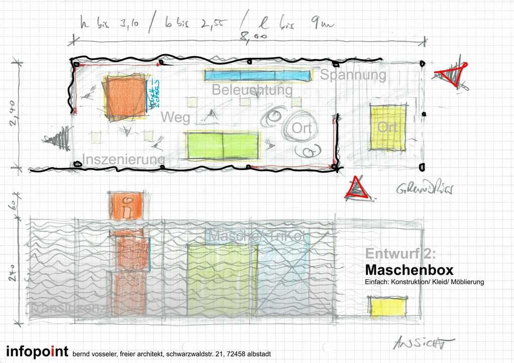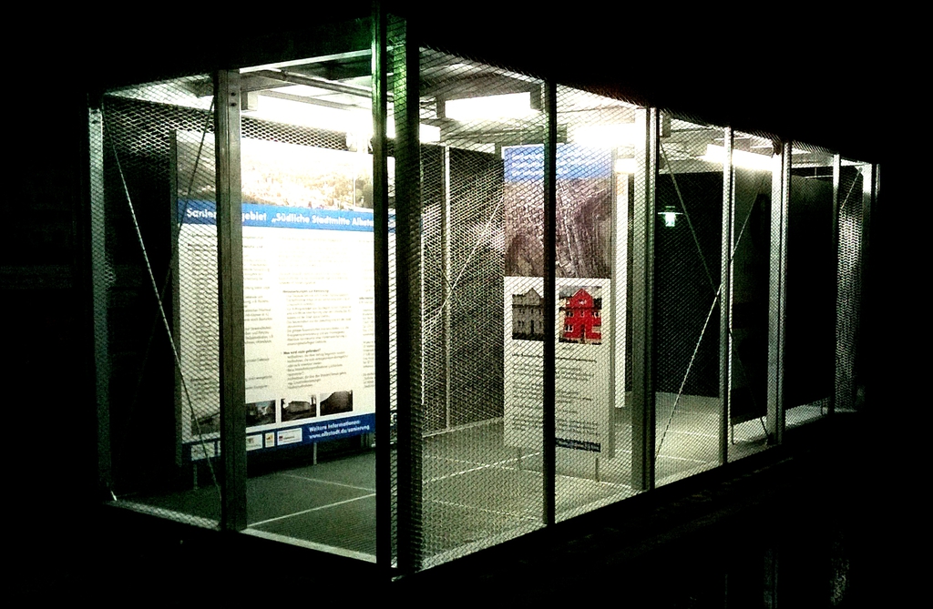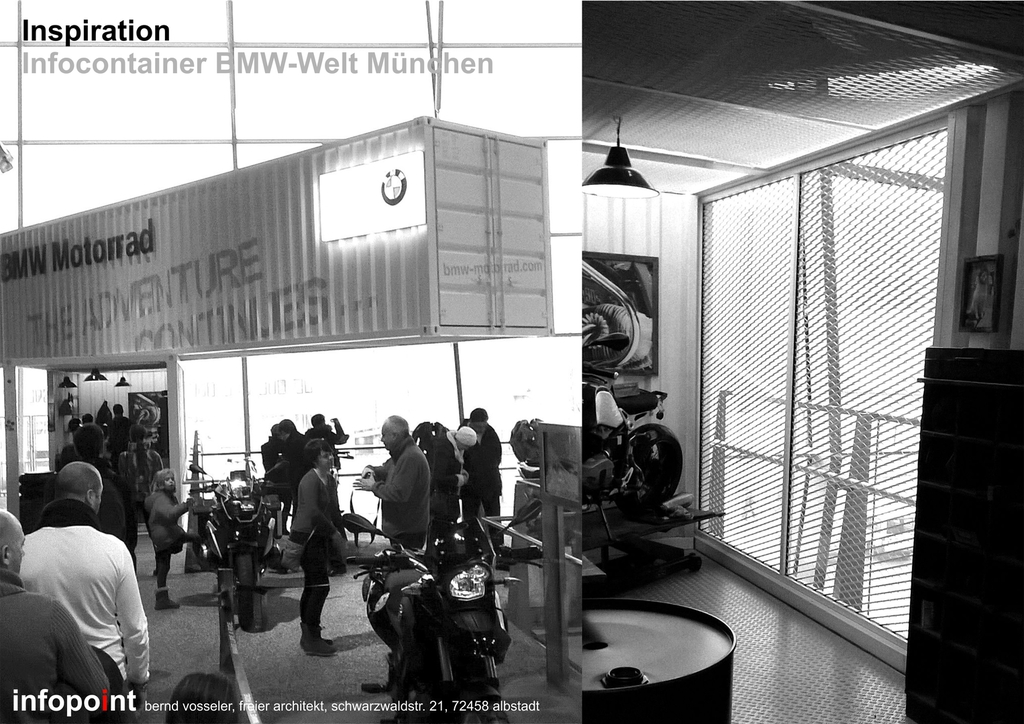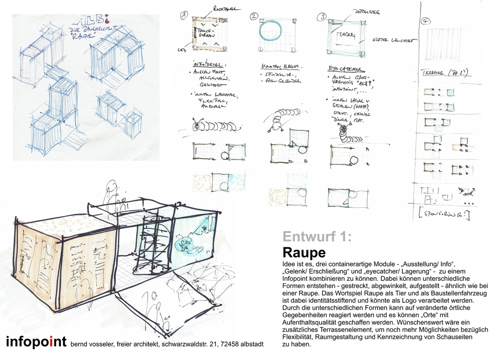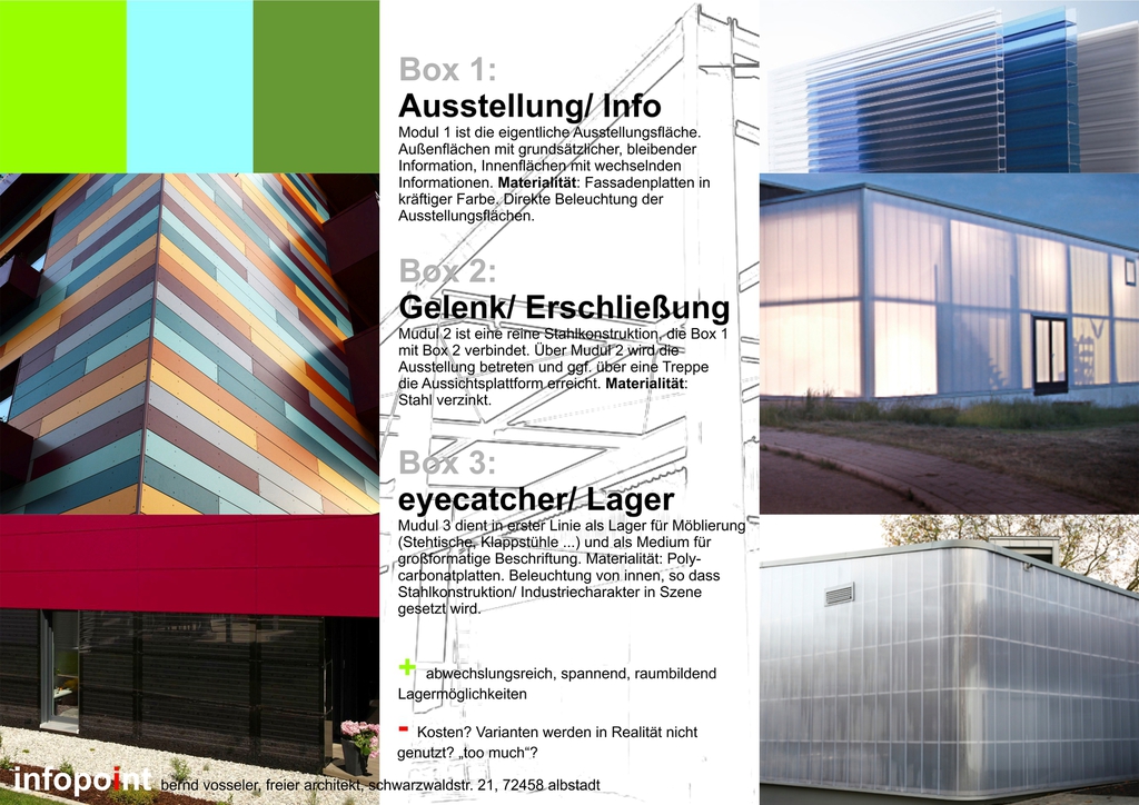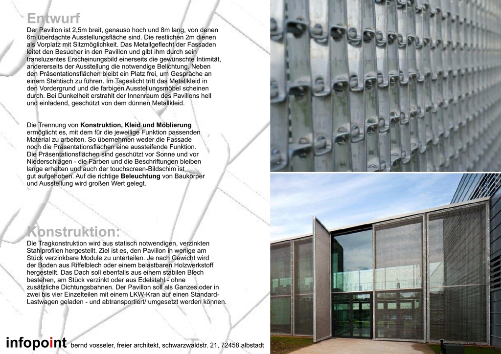 "infopoint" für Albstadts städtebauliche Baustellen. Anforderung: transportierbar, Tag und Nacht begehbar, flexibel bestück- und erweiterbar, kostengünstig, corporate identity. Im Entwurfsprozess wurde untersucht, welche Arten von Info-Einrichtungen schon realisiert wurden. Die Möglichkeit, einen Standardcontainer umzubauen wurde zwei Entwürfen gegenüber gestellt. Die Entscheidung fiel auf eine einfache Stahlkonstruktion mit transluzentem, schützendem aber gleichzeitig "wunderfitzigem", identitätsstiftendem "Maschenkleid" und "Möblierung". Realisiert wurden zunächst nur vier Ausstellungstafeln, wobei die im Entwurf dargestellten interaktiven Elemente wie "Ausziehtafeln", "touchscreen" oder auch nur ein QR-code zur Weiterleitung auf eine aktuelle Info-Seite des Stadtplanungsamtes jederzeit nachrüstbar sind. Der infopoint wurde in der Werkstatt und auf dem Bauhof Tailfingen komplett hergestellt und fertig ausgestattet und war - dank Transport-Ösen und höhenverstellbaren Füßen innerhalb von 10 Minuten an seinem ersten Standort - "Am Markt" in Tailfingen - für die Öffentlichkeit zugänglich. Wer gerade nicht persönlich vorbeischauen kann, kann hier per "Mausklick", "scroll" und "Maustaste festhalten" bei "Tag und Nacht" virtuell in den infopoint hineingehen.