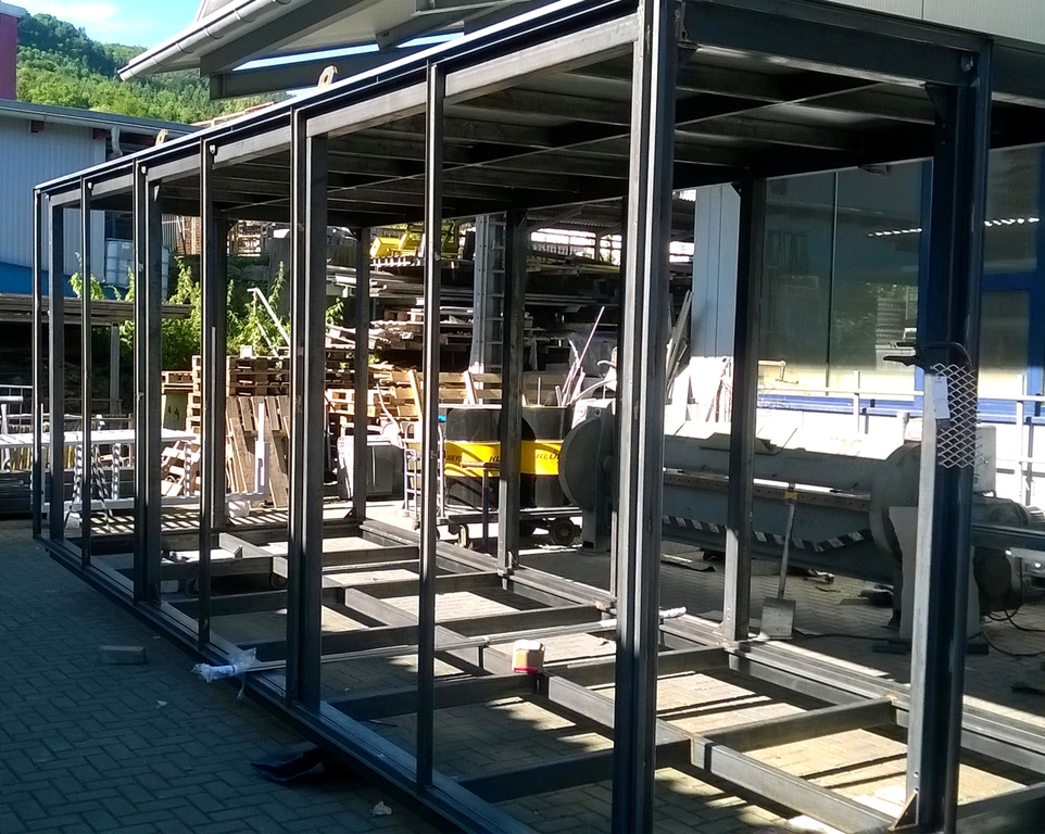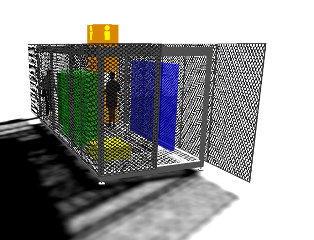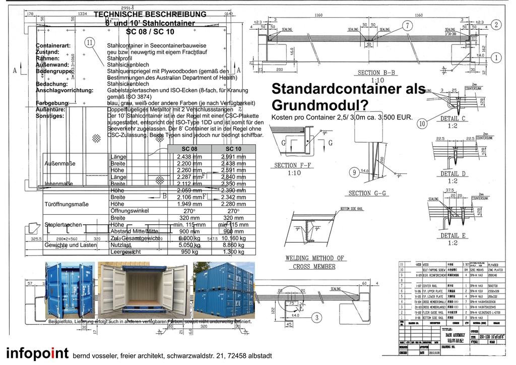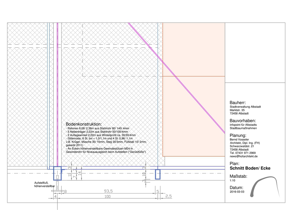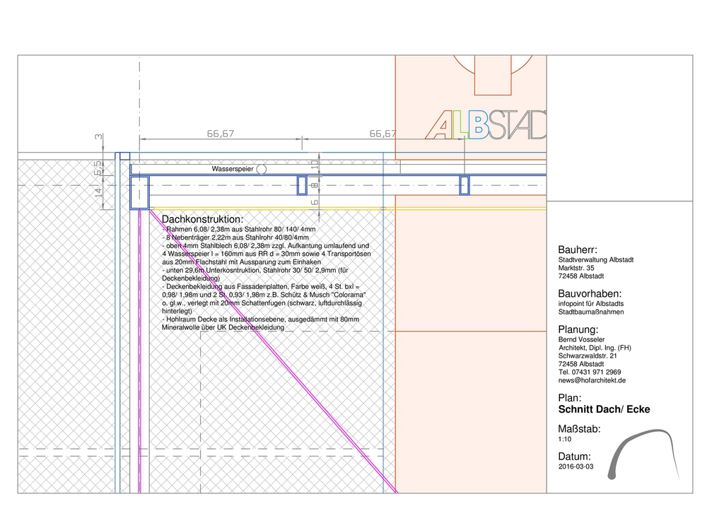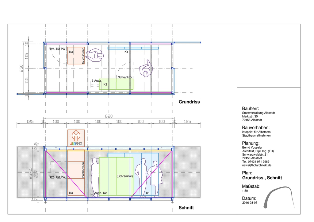 "infopoint" für Albstadts städtebauliche Baustellen. Anforderung: transportierbar, Tag und Nacht begehbar, flexibel bestück- und erweiterbar, kostengünstig, corporate identity. Im Entwurfsprozess wurde untersucht, welche Arten von Info-Einrichtungen schon realisiert wurden. Die Möglichkeit, einen Standardcontainer umzubauen wurde zwei Entwürfen gegenüber gestellt. Die Entscheidung fiel auf eine einfache Stahlkonstruktion mit transluzentem, schützendem aber gleichzeitig "wunderfitzigem", identitätsstiftendem "Maschenkleid" und "Möblierung". Realisiert wurden zunächst nur vier Ausstellungstafeln, wobei die im Entwurf dargestellten interaktiven Elemente wie "Ausziehtafeln", "touchscreen" oder auch nur ein QR-code zur Weiterleitung auf eine aktuelle Info-Seite des Stadtplanungsamtes jederzeit nachrüstbar sind. Der infopoint wurde in der Werkstatt und auf dem Bauhof Tailfingen komplett hergestellt und fertig ausgestattet und war - dank Transport-Ösen und höhenverstellbaren Füßen innerhalb von 10 Minuten an seinem ersten Standort - "Am Markt" in Tailfingen - für die Öffentlichkeit zugänglich. Wer gerade nicht persönlich vorbeischauen kann, kann hier per "Mausklick", "scroll" und "Maustaste festhalten" bei "Tag und Nacht" virtuell in den infopoint hineingehen.