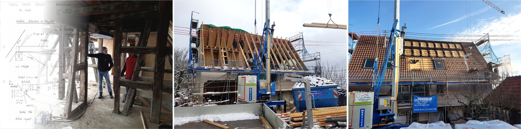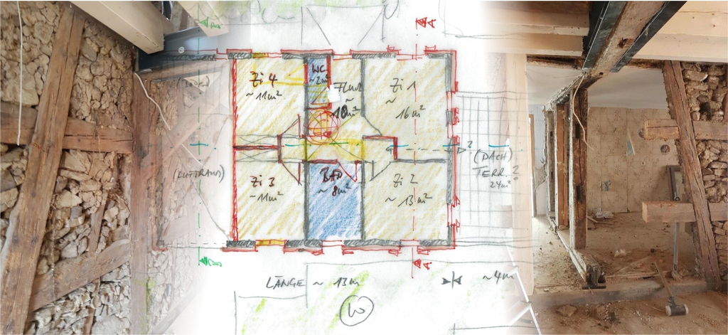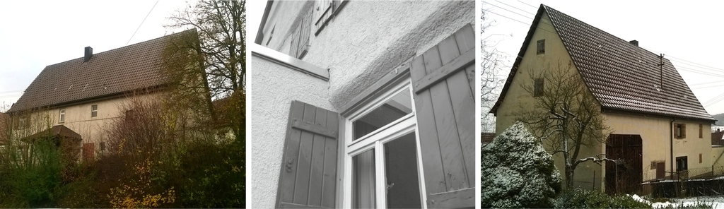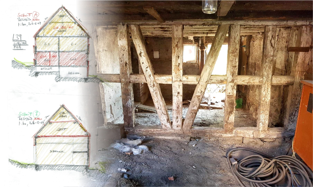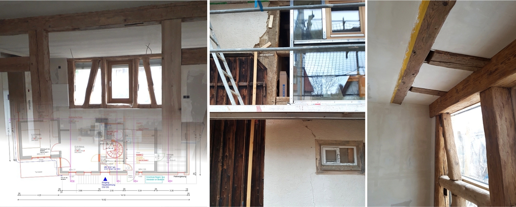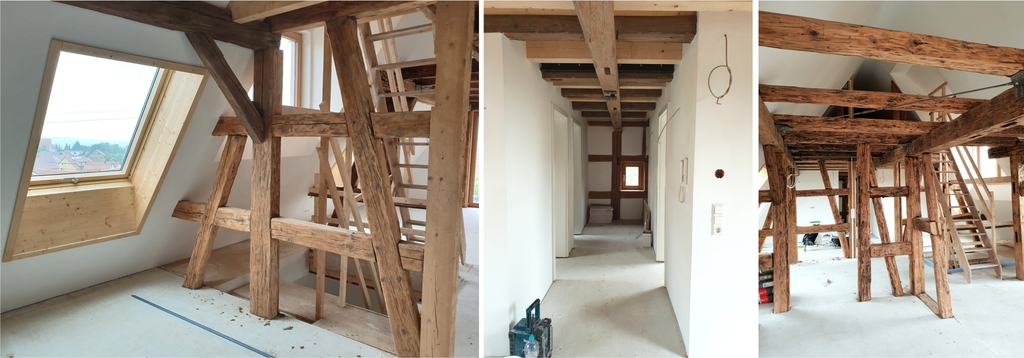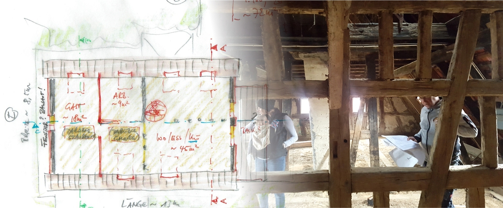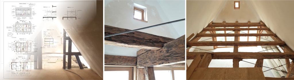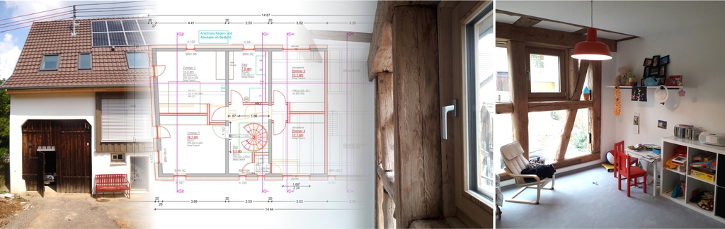 Das ehemalige Wohn- und Ökonomiegebäude schien unvekäuflich und eignete sich in den Augen Vieler bestenfalls um Platz für einen Neubau zu schaffen. Nicht so für die junge Bauherrschaft, Sohn eines Architekten mit Frau und Tochter. Sie erkannten die Möglichkeiten, die in dem großen Volumen steckten. Vom bisherigen Besitzer wurde - ganz klassisch - nur der "Wohnteil" des Bauernhauses genutzt, also nur wenige Zimmer in Erd- und Obergeschoss. Stall- und Scheunenachse wie auch der gesamte Dachraum standen leer. Um die mittlerweile vierköpfige Familie unter zu bringen bestand der Wunsch das gesamte Dachgeschoss als Wohnraum zu nutzen und den bestehenden Wohnraum im Obergeschoss in den "Ökonomieteil" hinein zu erweitern. Das Erdgeschoss sollte einen separaten Zugang bekommen und Platz für eine Einliegerwohnung bieten. Genau so wurde der Plan auch umgesetzt. Wo notwendig wurden Bauteile saniert, ersetzt oder behutsam verstärkt und es entstand ein großartiges Raumerlebnis, bei dem der Altbau zu spüren - und an vielen Details abzulesen ist. Dachterrasse im OG und Balkon im DG tragen zum hohen Wohnkomfort bei. Beheizt wird das KfW-70-Haus mittels Fußbodenheizung und Luft-Wasser-Wärmepumpe. Eine Photovoltaik-anlage trägt zu deren fast CO2-neutralem Antrieb bei und leistet ihren Beitrag zum Abdecken des Haushaltsstroms. Fassade und Dach wurden aufgrund der Nähe zur benachbarten, denkmalgeschützten Kirche mit dem Denkmalamt abgestimmt. Am Abbruch, vor allem aber am Innenausbau und an Konstruktiven Einbauten im Außenbereich beteiligte sich der Bauherr mit großem Einsatz, vielen Ideen und Details, die aus dem Haus das "eigene, unverwechselbare Traumhaus" machen.