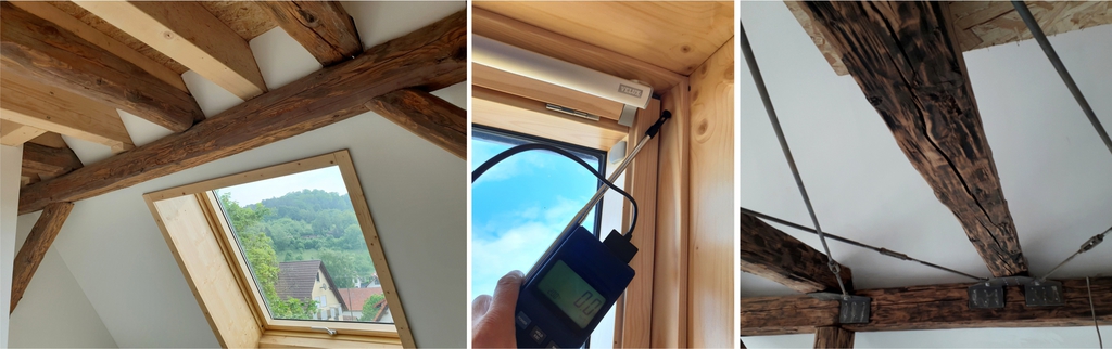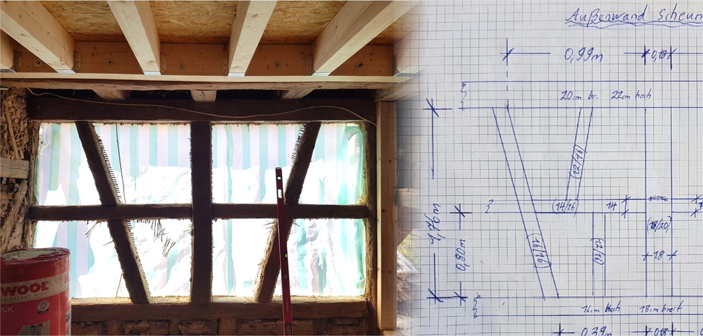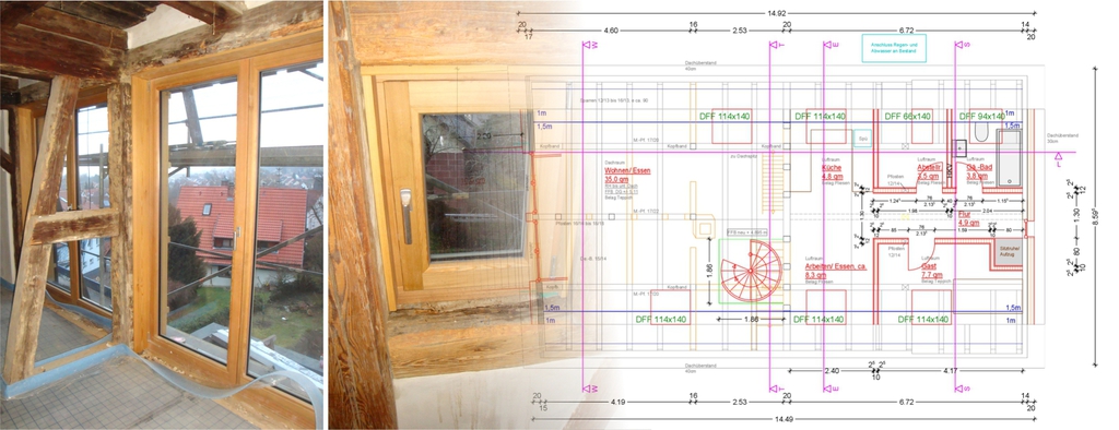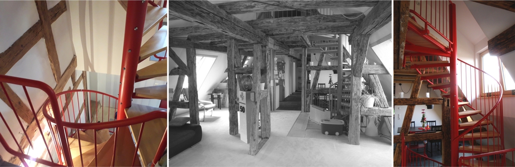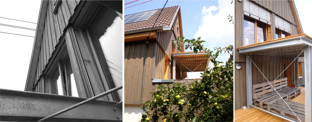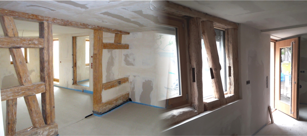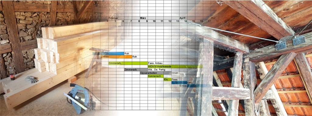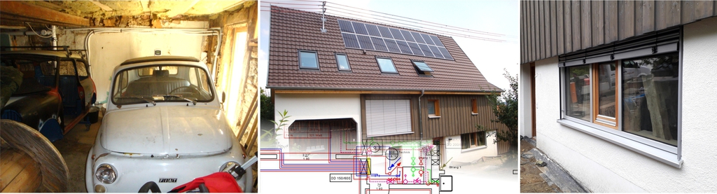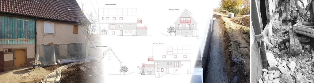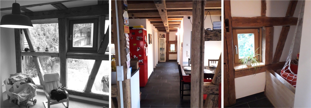 Das ehemalige Wohn- und Ökonomiegebäude schien unvekäuflich und eignete sich in den Augen Vieler bestenfalls um Platz für einen Neubau zu schaffen. Nicht so für die junge Bauherrschaft, Sohn eines Architekten mit Frau und Tochter. Sie erkannten die Möglichkeiten, die in dem großen Volumen steckten. Vom bisherigen Besitzer wurde - ganz klassisch - nur der "Wohnteil" des Bauernhauses genutzt, also nur wenige Zimmer in Erd- und Obergeschoss. Stall- und Scheunenachse wie auch der gesamte Dachraum standen leer. Um die mittlerweile vierköpfige Familie unter zu bringen bestand der Wunsch das gesamte Dachgeschoss als Wohnraum zu nutzen und den bestehenden Wohnraum im Obergeschoss in den "Ökonomieteil" hinein zu erweitern. Das Erdgeschoss sollte einen separaten Zugang bekommen und Platz für eine Einliegerwohnung bieten. Genau so wurde der Plan auch umgesetzt. Wo notwendig wurden Bauteile saniert, ersetzt oder behutsam verstärkt und es entstand ein großartiges Raumerlebnis, bei dem der Altbau zu spüren - und an vielen Details abzulesen ist. Dachterrasse im OG und Balkon im DG tragen zum hohen Wohnkomfort bei. Beheizt wird das KfW-70-Haus mittels Fußbodenheizung und Luft-Wasser-Wärmepumpe. Eine Photovoltaik-anlage trägt zu deren fast CO2-neutralem Antrieb bei und leistet ihren Beitrag zum Abdecken des Haushaltsstroms. Fassade und Dach wurden aufgrund der Nähe zur benachbarten, denkmalgeschützten Kirche mit dem Denkmalamt abgestimmt. Am Abbruch, vor allem aber am Innenausbau und an Konstruktiven Einbauten im Außenbereich beteiligte sich der Bauherr mit großem Einsatz, vielen Ideen und Details, die aus dem Haus das "eigene, unverwechselbare Traumhaus" machen.