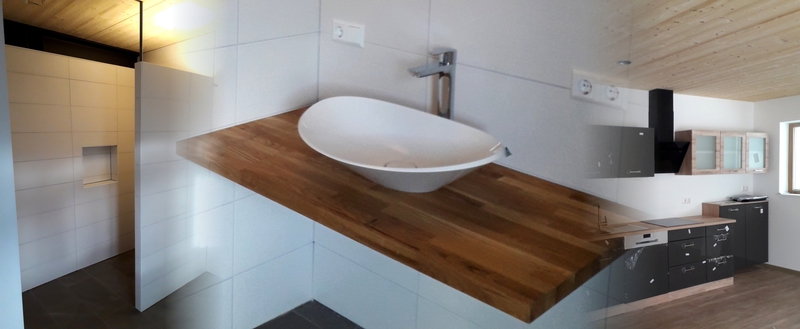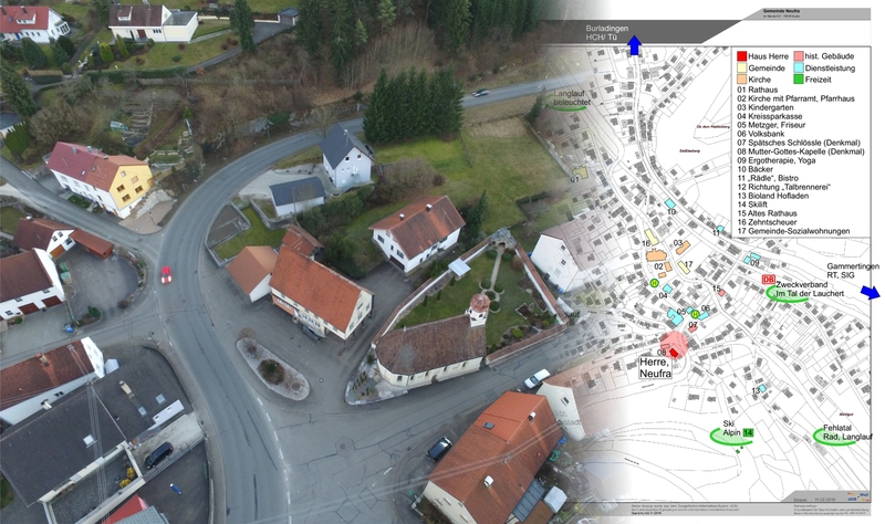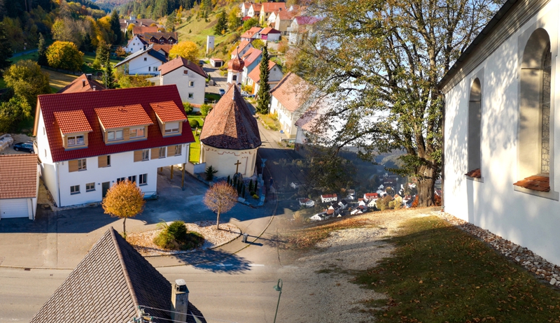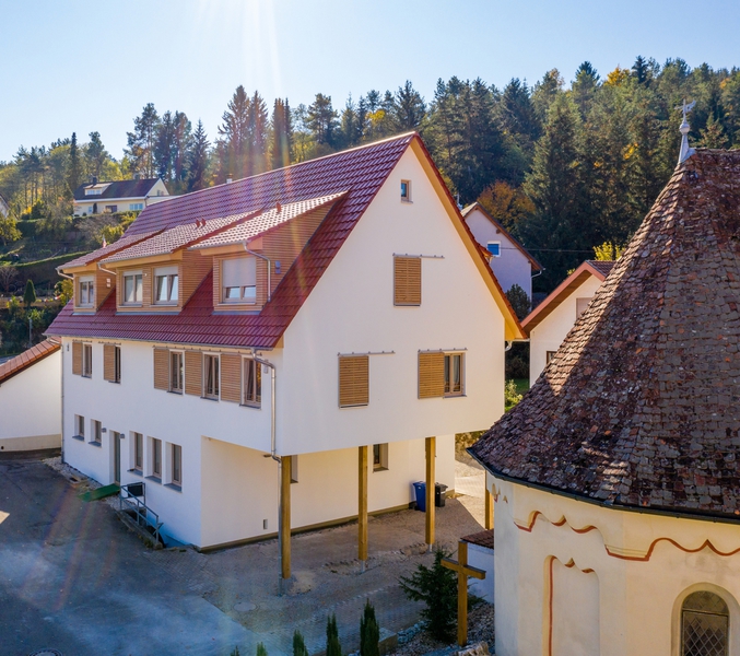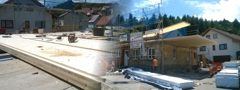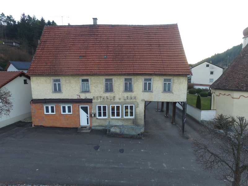 Das "Gasthaus Lamm" ist eine der beiden letzten Schankwirtschaften im Ort. Es hat als "Gasthof zum Lamm" eine lange Tradition und - trotz Baufälligkeit - einen funktionierenden Stammtisch. Bei der Gemeinde stand das Gebäude mit an höchster Stelle der Prioritätenliste im Ortsentwicklungsplan. Aus diesen Gründen entschieden sich die Bauherren zu einer kompletten Sanierung des Gebäudes. Ober- und Dachgeschoss standen jahrzehntelang leer. Aufgrund des maroden Zustandes und der angestrebten, komfortablen Wohnnutzung fiel die Entscheidung auf Rück- und Neuaufbau. Die Gastwirtschaft im Erdgeschoss sollte aber erhalten bleiben. Durch behutsame Vorgehensweise und mit Hilfe eines Schutzdaches konnte dieser Wunsch realisiert werden. Die Statik wurde überprüft und Tragstrukturen überarbeitet. Es wurden Beton-Ringgurte auf das bestehende Mauerwerk aufgesetzt um darauf eine neue Brettstapeldecke auflegen zu können. Darauf entstand ein Neubau in Holzständerbauweise. Ober- und Dachgeschoss besitzen KfW-70-Niveau und beherbergen vier Wohnungen mit Fußbodenheizung sowie Lüftungsanlage mit Wärmerückgewinnung. Die Gaststätte im Erdgeschoss wurde erweitert und saniert. Sie kehrt zurück zum traditionellen Namen und bietet nun ausreichend Platz für eine Gastronomieküche samt notwendiger Nebenräume, ohne dabei den Charme der Dorfwirtschaft verloren zu haben. Fotos - v.a. aus der Vogelperspektive - z.T. von Gerold Roth, wie auch diese tolle Drohnen-Dokumentation.