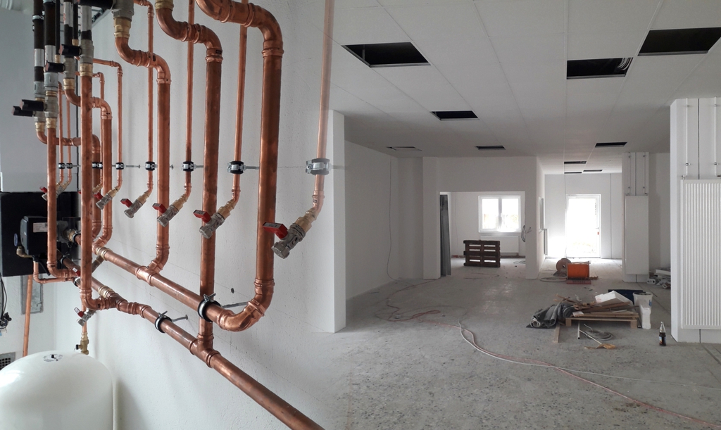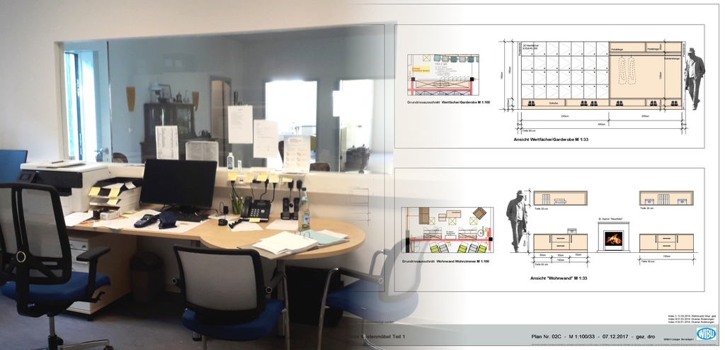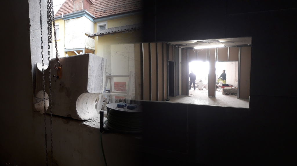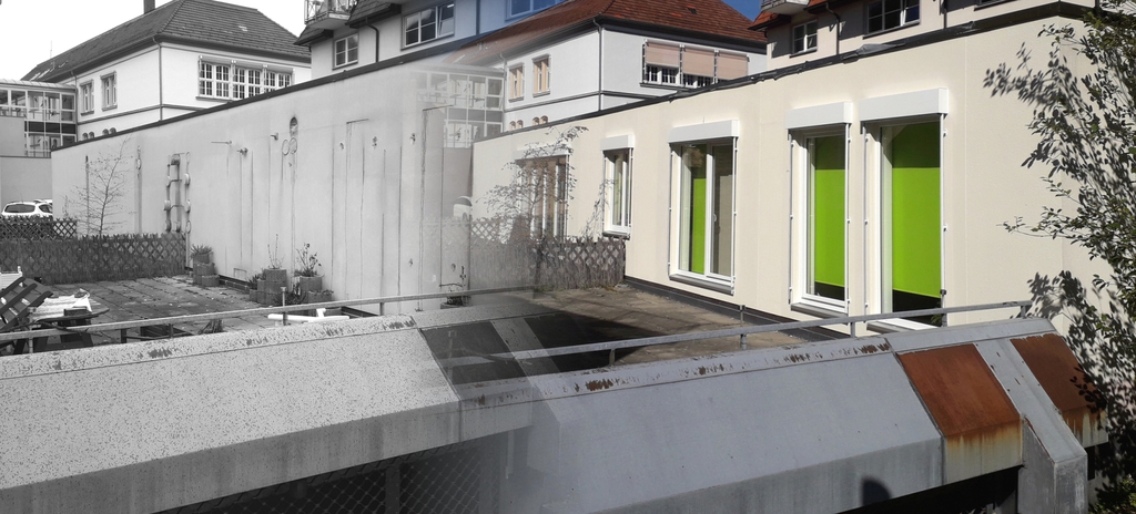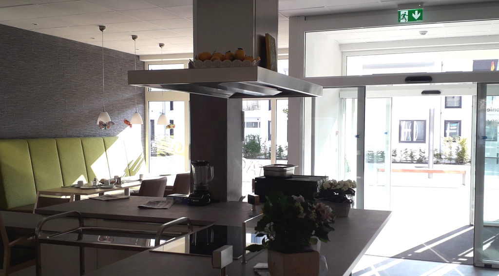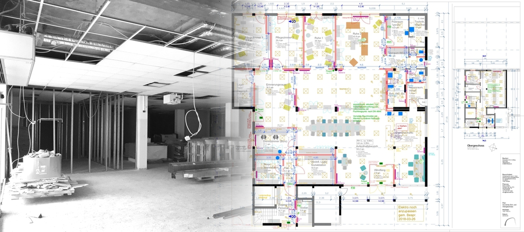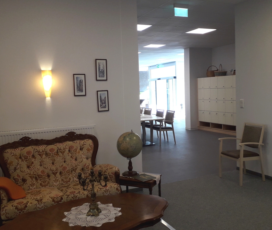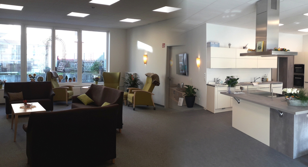 Die Kirchliche Sozialstation Albstadt wollte ihr Dienstleistungsangebot um eine Tagespflegeeinrichtung für Senioren erweitern. Als geeigneter Standort wurde die "Neue Mitte" von Tailfingen angesehen, um die Senioren am Stadtleben mit Wochenmarkt, Eisdiele, Läden und Passanten teilhaben zu lassen. Als Räumlichkeit konnte ein seit Jahren leerstehender Einkaufsmarkt gewonnen werden, im Erdgeschosse eines großen Wohn- und Geschäftshauses. Schon immer war diesem Erdgeschoss eine separat zugängliche Fläche im Obergeschoss zugeteilt und so entstand die Idee, dort das bis dahin auf engstem Raum agierende Tailfinger Pflegeteam unterzubringen. Auf insgesamt über 600m² Fläche entstanden innerhalb kürzester Bauzeit Aufenthalts- und Büroräume. Durch aufwendige Betonsägearbeiten konnte Tageslicht in das bisher fensterlose Erdgeschoss transprtiert werden. Es wurden Wände eingezogen und unterschiedliche Bereiche und Räume geschaffen, wie z.B. Ruheräume, Zimmer mit Pflegebetten, ein Erinnerungsraum, ein Essbereich mit Wohnküche und Bistrobereich, ein Veranstaltungsbereich samt Präsentationstechnik, Büro-, Sanitär- und Lagerflächen. Mit sehr viel Engagement und Geschmack kümmerte sich die Kirchenpflegerin mit Team um die Einrichtung der Räumlichkeiten wie auch um die Realisierung des gesamten Projekes.